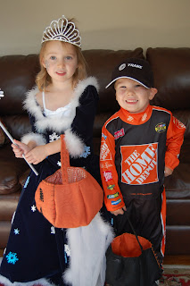 Here we are before heading out to Boo Ha Ha. Katie was a Snow Princess and Patrick was a race car driver (or as we found out, Tony Stewart, the race car driver).